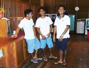 Cause we already had a good appetite we appeared on time. We quickly found the table reserved for us which was decorated with fresh flowers. A glance through the huge hall reminded us that it was not the main season. Just a few tables were taken by couples or some bigger tables by guests who either travelled together or made friends during their diving adventures. The following days we noticed that most of them came from the german-speaking area, but also some from Italy, the Netherlands, the US and France. As soon as we took our seats one of the waiters handed us the menu (e.g. lunch). We had the choice between western and Indonesian cooking, between meat, fish and seafood. Besides that there were dishes for enthusiasts of the Italian kitchen, for Vegetarians and... Hamburger with French fries. As starter I chose a delicious pumpkin soup, as dessert a dish of ice-cream. Besides soft drinks one could choose between different kinds of red and white wines, as well as beers (big and small bottles). The waiters were always quickly on the spot. They were standing in the background during meals but observed unobtrusively if guests were in need of something. They were very friendly, but at the same time always respectful and never obtrusive. While still waiting for our starter the manager of the dive center went from table to table and discussed the plans for the next day with the divers. After the dinner Hanne, the perfectly German-and English-speaking Danish manager and owner of the resort appeared to welcome one or two guests or just for a little talk.