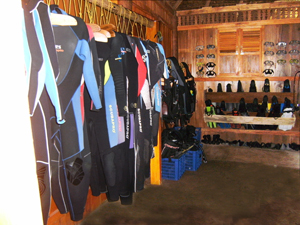 Diving suits, boat and ABC equipment in all sizes and in sufficient number available |