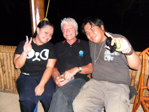 Whenever an occasion could be found, there was a party in RAJA LAUT. If these were the birthday of guests, a farewell or any anniversary. Beside Roberto and Syvia (picture on the right) all residents of the Resort took usually part, but also locals joined with pleasure. Because the Bunaken people party with pleasure, particularly if there is palm wine for free. Then after the dinner the house band prepared their partially self-made instruments in the open-air restaurant. Then it was made music with enthusiasm and in the course of the evening the music became better and better (why oh why?). During such a party there were presented a mixture of traditional and modern Indonesian, but also international songs. Some of us danced and some remaind seated and took pleasure in the general sociability.